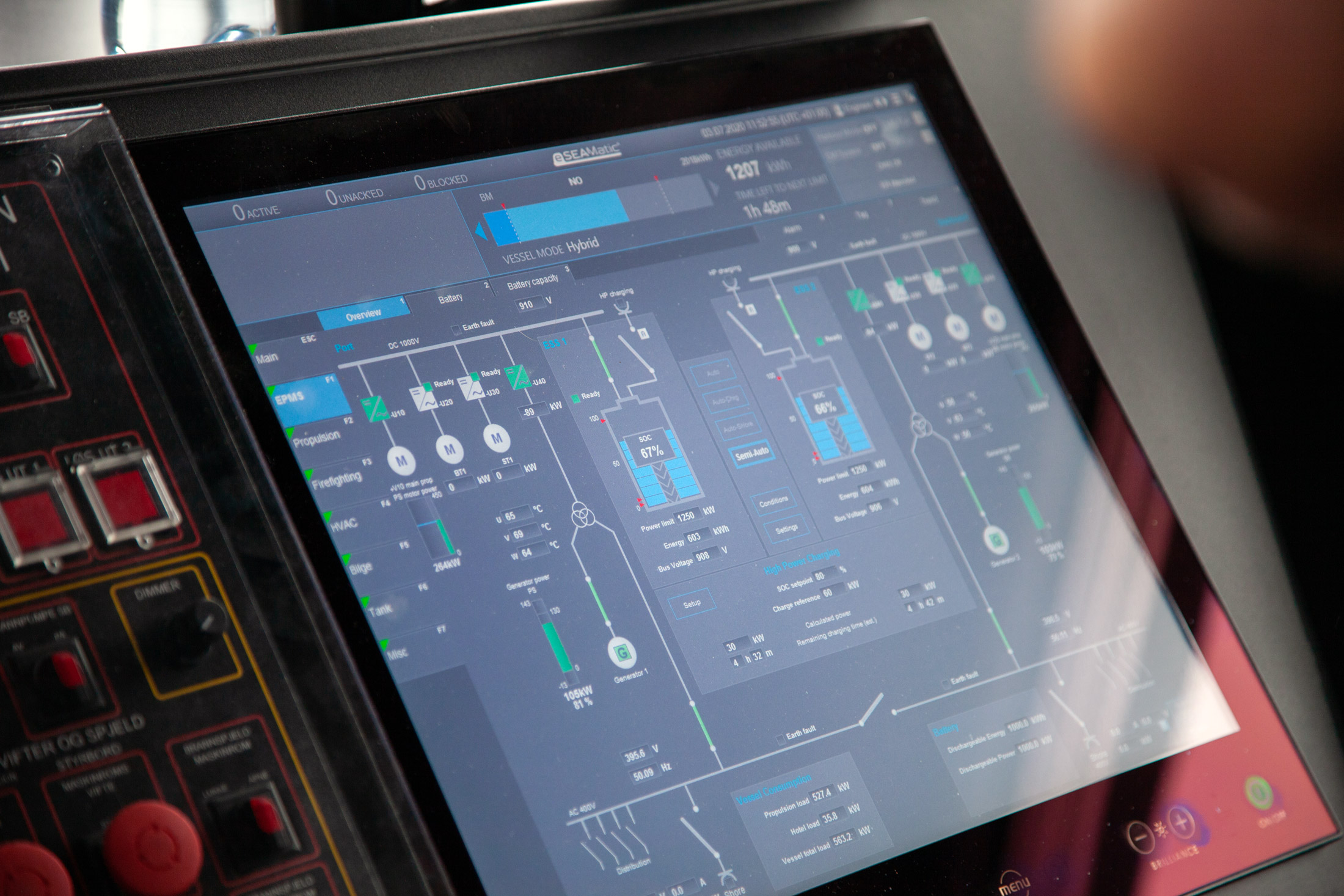 A large liquid crystal display on the bridge highlights the vessel's battery status at all times. The Rygerelektra typically starts with 85% charge. After a three-hour, 40 nautical mile round trip through the fjords – it runs at around 15 knots, but, the company says, can handle 23 knots in speed tests — the ferry winds up back in Stavanger with about 15% battery power remaining.