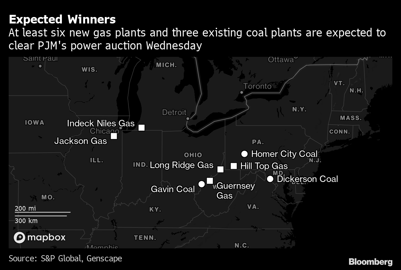 PJM Interconnection LLC, which keeps the lights on for 65 million people from Chicago to Washington, D.C., is expected to clear a fleet of new natural gas plants-- and even extend the lives of some coal plants -- when it releases the results of its massive electricity auction Wednesday. That’s because Trump-era changes to the way the auction is structured give a leg fossil fuels, at the expense of zero-carbon sources such as nuclear, wind and solar.