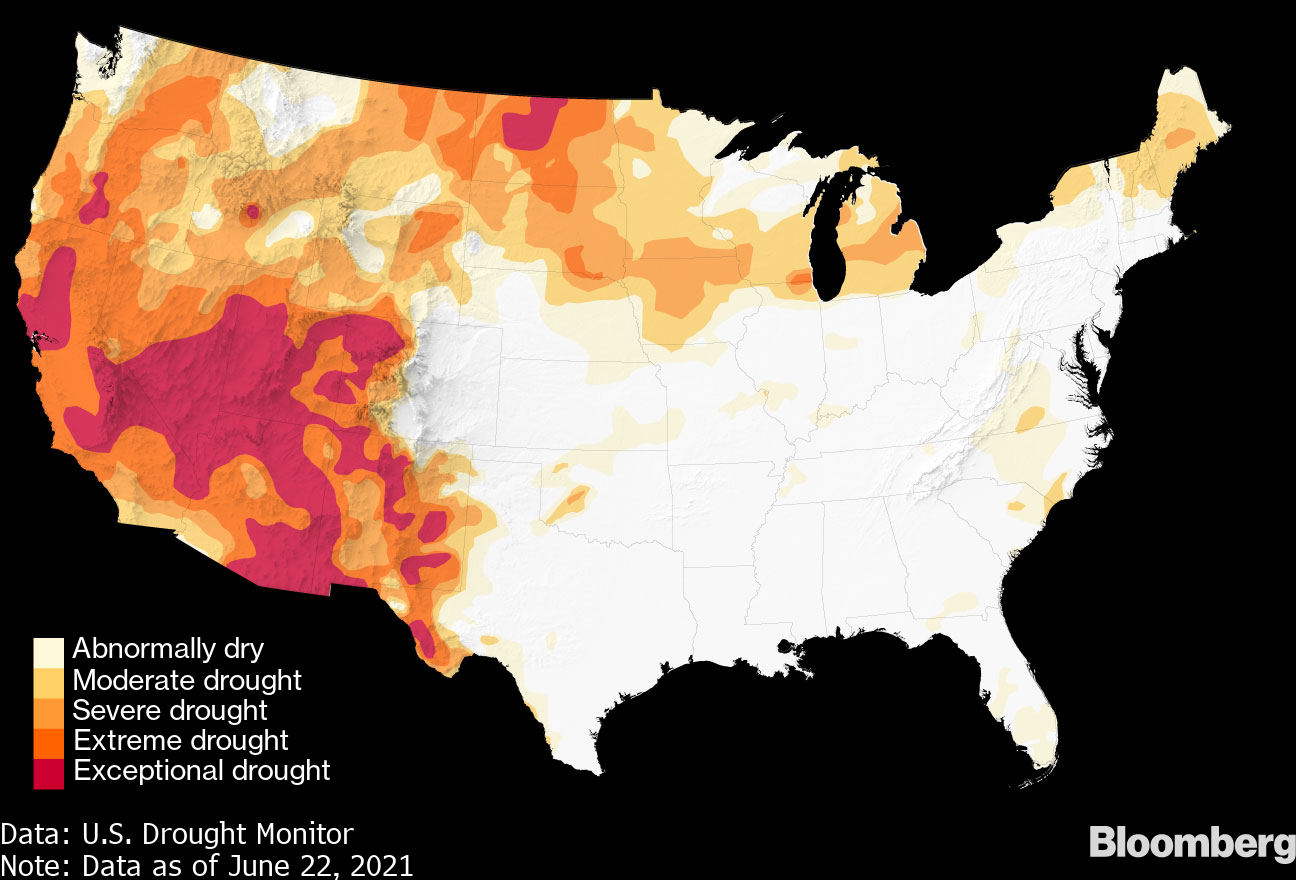 From June 2020 to May 2021, California posted its driest 12-month period on record, according to the National Centers for Environmental Information. So too did Arizona and Utah, while Idaho, Wyoming, New Mexico, Nevada and North Dakota all placed in the top 10. California just finished its fourth driest spring on record; Washington, Oregon and Idaho their second. Forecasts call for drought to remain locked in across the West, and by August drought conditions could spread into Nebraska and eastern Colorado.