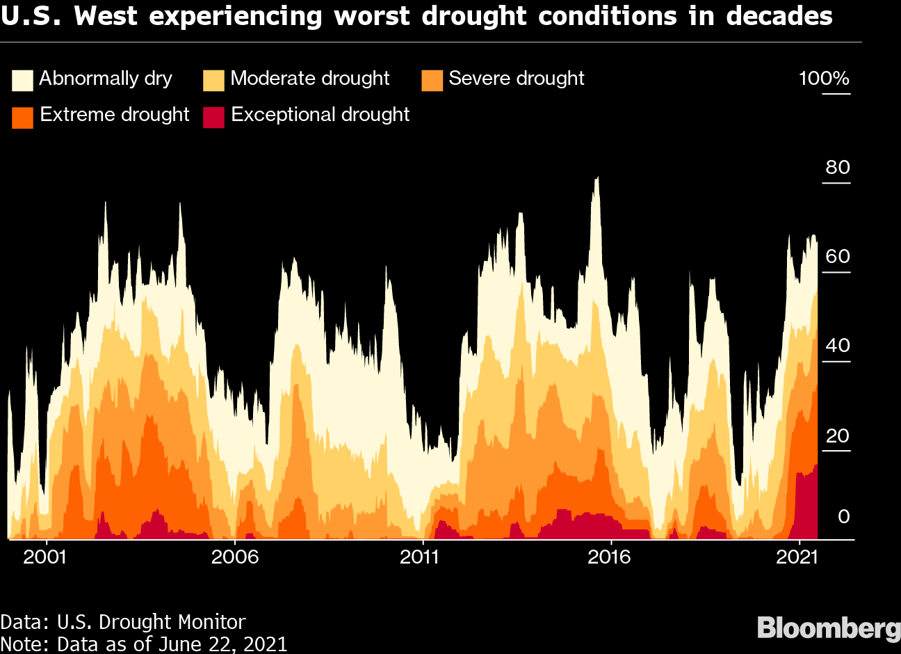 (Bloomberg) -- Sarah Brunner opened the irrigation spigots on her farm in March, three months early. The rain should have still been falling in California. Now that summer is taking hold, she and her husband are considering shifting their meager water supplies into pastures so their animals will have enough to eat.