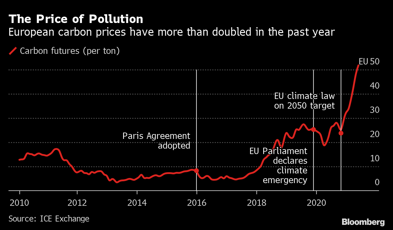 Government carbon pricing policy is another factor in the equation. Under Europe’s Emissions Trading System, companies either pay to pollute, a cost that has doubled in the past year, or invest in new technology to avoid producing carbon. To protect industries from becoming uncompetitive as a side effect of stricter climate policies, Europe now wants to impose a carbon border tax, or penalty for bringing emissions embedded in goods like steel or cement into the bloc.
