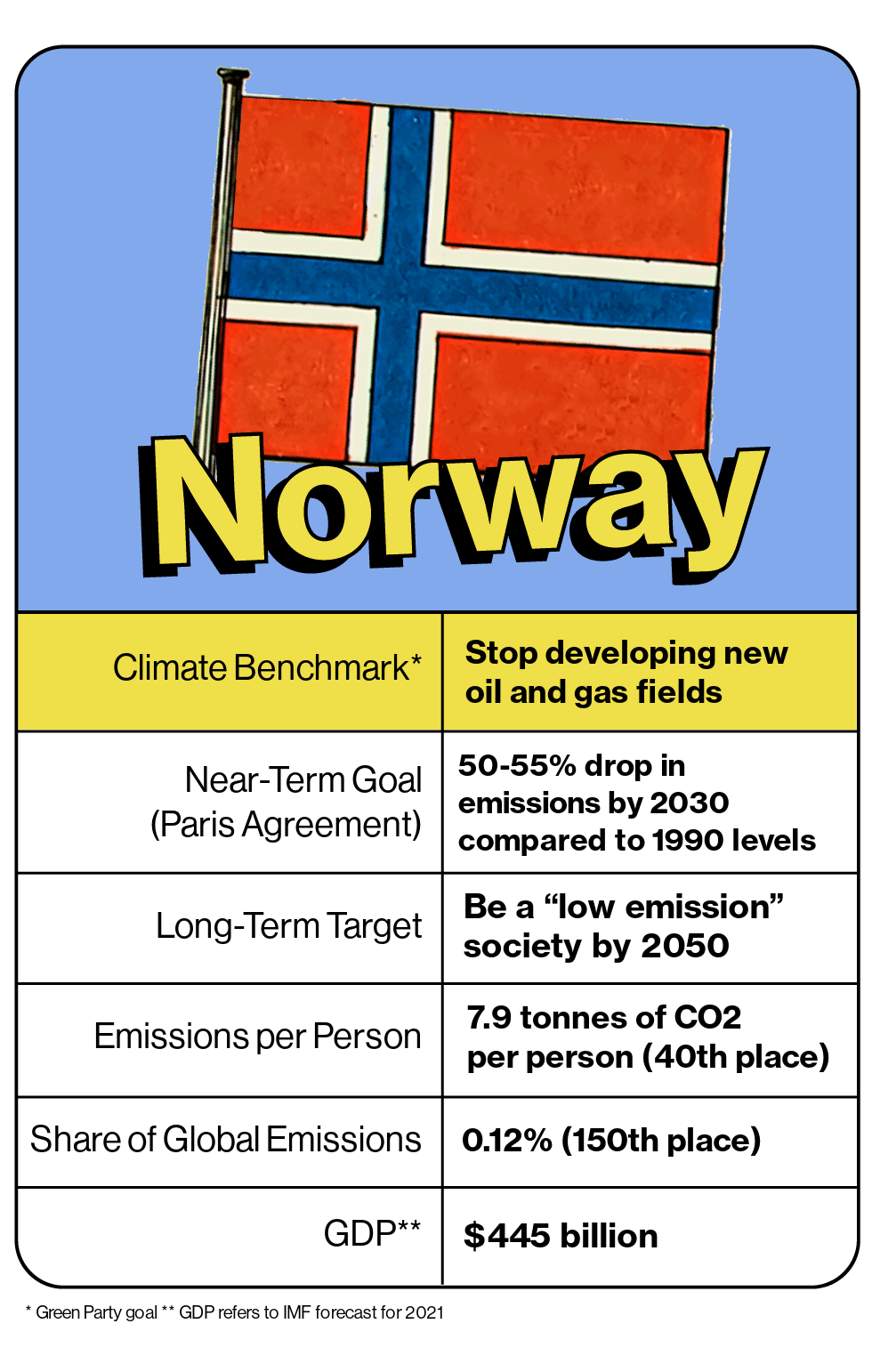 Through its membership of the European Economic Area, Norway has committed to a cut of 50% to 55% by 2030 in so-called non-quota emissions from sectors including agriculture, waste and transport. While it doesn’t have a net-zero goal, the nation aims to cut overall pollution as much as 95% by mid-century and touts the carbon-absorbing power of its vast forests. None of its targets take into account emissions from the oil and gas that Norway sells to other countries.