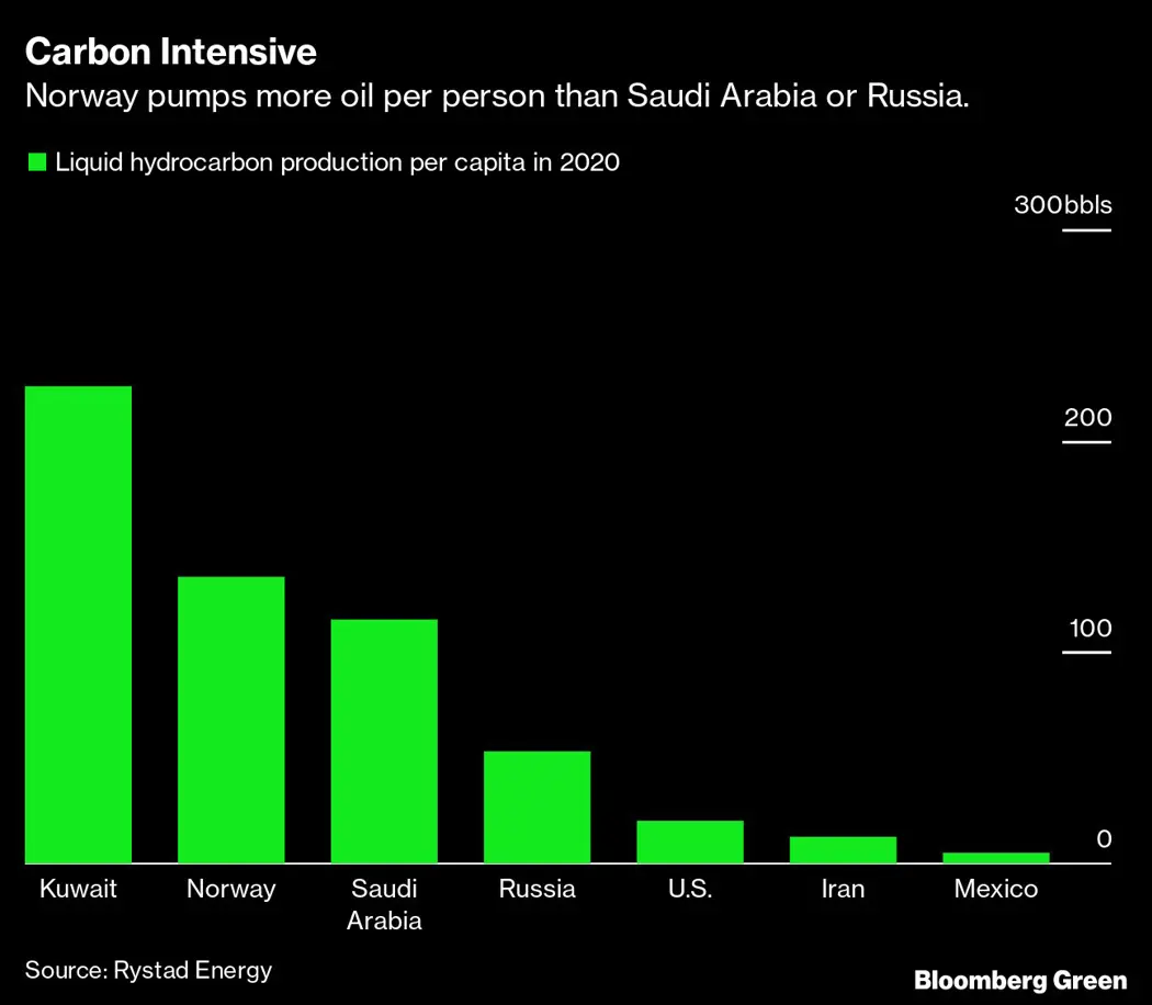 Norway portrays itself as progressive and environmentally conscious, but is also Western Europe’s largest oil and gas producer. On a per-capita basis, it has more electric cars than any other country while pumping more oil than Saudi Arabia or Russia.