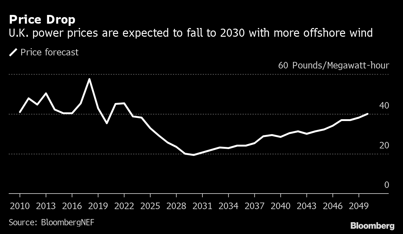 But it won’t last. While wind-power growth in the coming decade will depress prices in the U.K., the increased electrification of energy use will subsequently drive them up, he said.