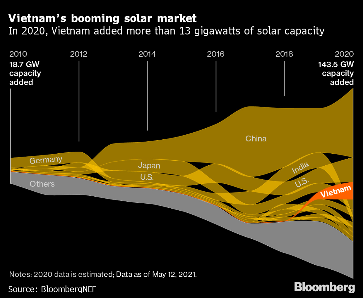 Tuan’s farm is just one tiny part of the extraordinary 100-fold increase in solar power that’s taken place in Vietnam over the last two years. The Southeast Asian nation now ranks seventh in the world in terms of capacity, according to clean energy research group BloombergNEF, and in 2020 the only countries that installed more solar panels were the U.S. and China.