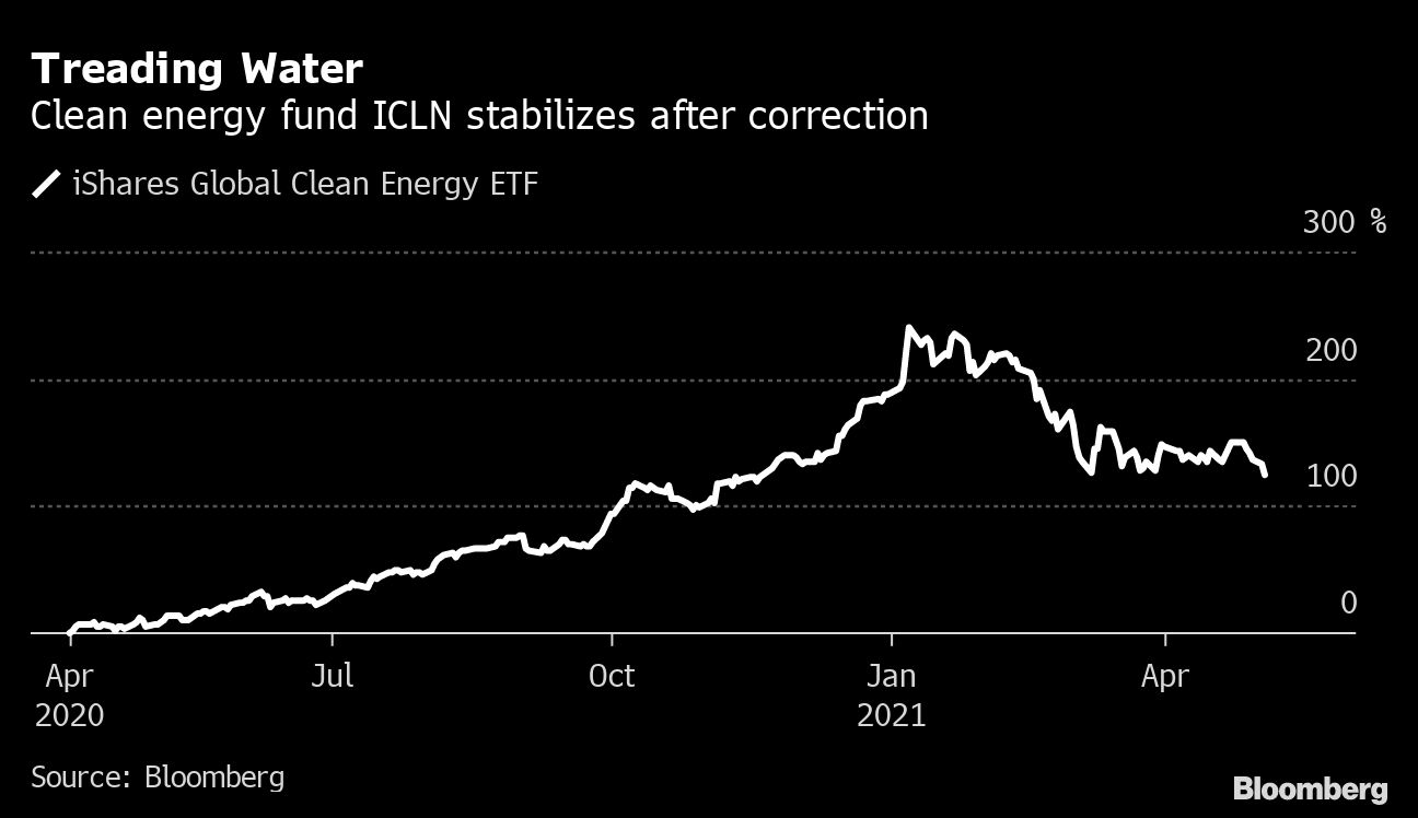 Popular funds in the clean-energy category such as the iShares Global Clean Energy ETF (ICLN) and Invesco Solar ETF (TAN) have notched a stellar run, rallying 140% and 234% respectively in 2020. That gave way to a drop in the first months of 2021, with the funds each falling more than 21% year-to-date.