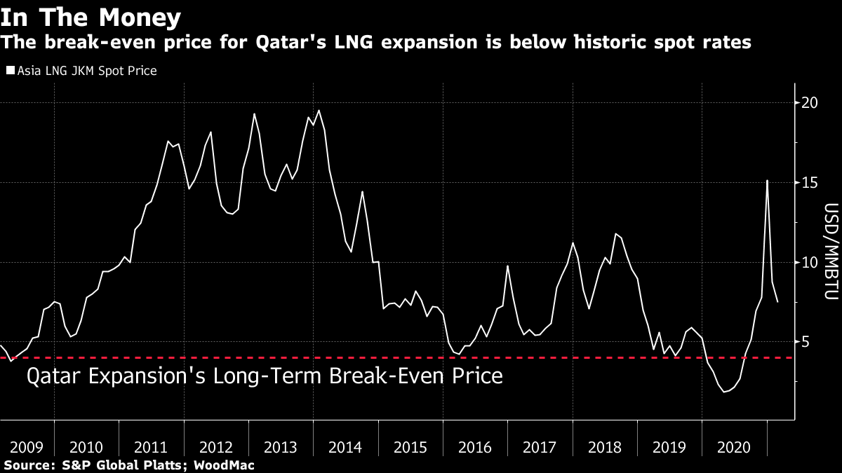 The lack of new supply from other countries will benefit Qatar, Energy Minister Saad Al-Kaabi, who is also chief executive officer of QP, said in an interview with Bloomberg in February. “Our expansion is very timely,” he said.