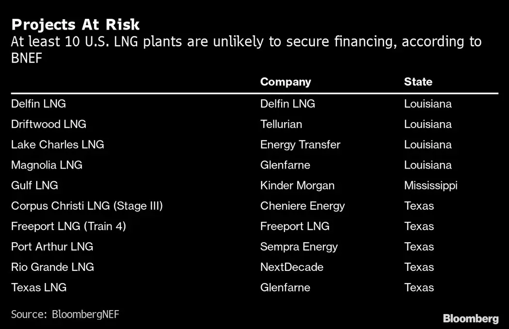 Yet U.S. projects are among those most likely to struggle. At least 10, five of them in Texas and four in Louisiana, probably won’t secure enough financing to be completed, according to analysis from BloombergNEF.