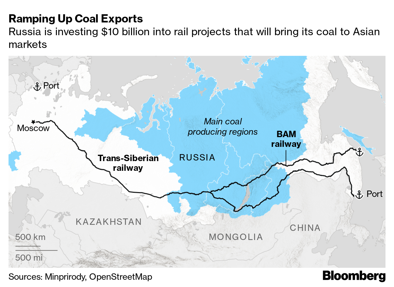 “It's realistic to expect Asian demand for imported coal to increase if conditions are right,'' said Evgeniy Bragin, Deputy Chief Executive Officer at UMMC Holding, which owns a coal company in western Siberia’s Kuzbass region. “We need to keep developing and expanding the rail infrastructure so that we have the opportunity to export coal.’’The latest 720 billion ruble ($9.8 billion) project to expand Russia’s two longest railroads — the Tsarist-era Trans-Siberian and Soviet Baikal-Amur Mainline that link western Russia with the Pacific Ocean— will aim to boost cargo capacity for coal and other goods to 182 million tons a year by 2024. Capacity already more than doubled to 144 million tons under a 520 billion ruble modernization plan that began in 2013. Putin urged faster progress on the next leg at a meeting with coal miners in March.“Russia is trying to monetize its coal reserves fast enough that coal will contribute to GDP rather than being stuck in the ground,” said Madina Khrustaleva, an analyst who specializes in the region for TS Lombard in London.Putin is betting that his country’s land border with China and good relations with President Xi Jinping make it a natural candidate to dominate exports to the nation that consumes more than half of the world’s coal. His case is helped by the fact that Australia, currently the number one coal exporter, is facing trade restrictions from China amid a diplomatic dispute over the origins of the coronavirus.