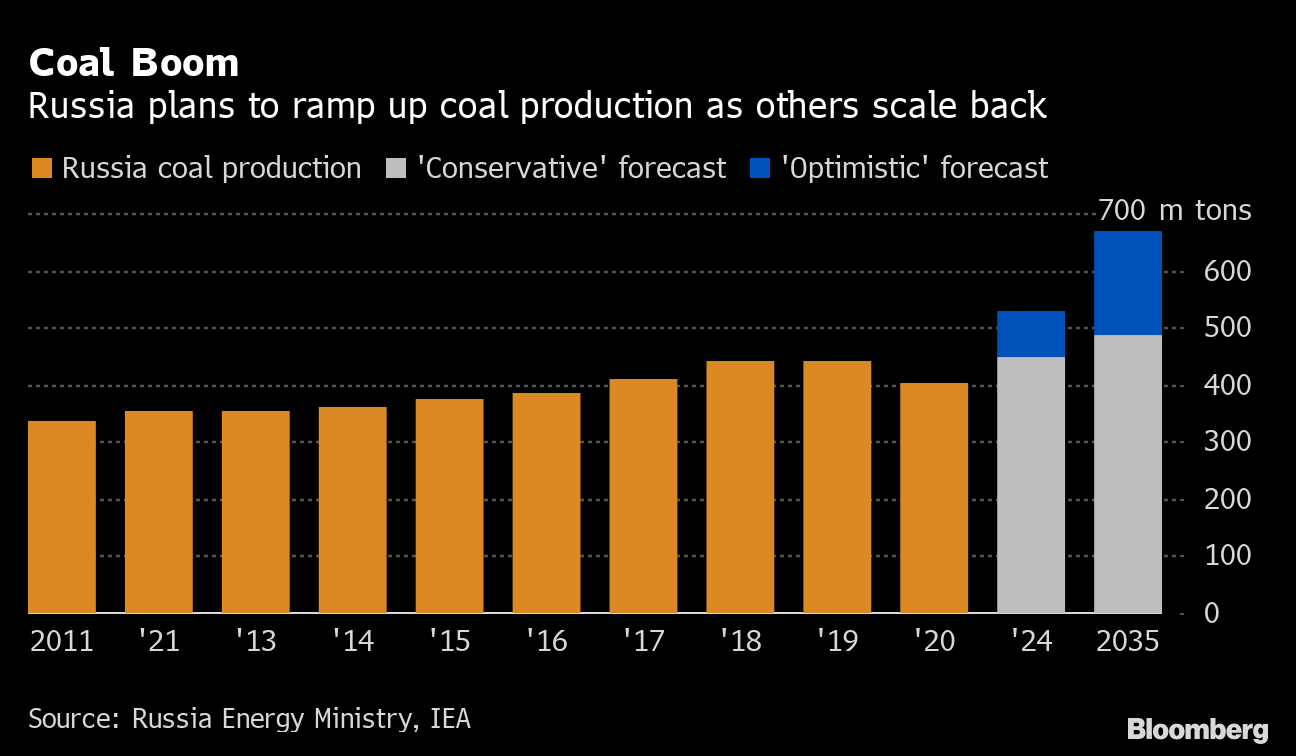 The country’s biggest coal producers are privately run, meaning they aren’t facing the kind of financing problems currently being encountered by listed companies elsewhere as banks pull back funding for dirty energy. Suek Plc, owned by billionaire Andrey Melnichenko, and Kuzbassrazrezugol OJSC, controlled by Iskander Makhmudov, are both planning to increase output. Russia also plans to boost coal production for steel making. A-Property, owned by Russian businessmen Albert Avdolyan, bought the Elga coal mine in Russia’s Far Eastern region of Yakutia last year and plans to invest 130 billion rubles to expand output to 45 million tons of coal from the current 5 million tons by 2023. A third stage of Russia’s railroad expansion project will focus on boosting infrastructure for shipping coal out of Yakutia, a Russian Railways official said last month.“In 2021, many Asia Pacific states have seen their economies recover from the pandemic,” said Oleg Korzhov, the CEO of Mechel PJSC, one of Russia’s biggest coal companies. “We expect that demand for metallurgical coal in Asia Pacific will remain high in the next five years.”