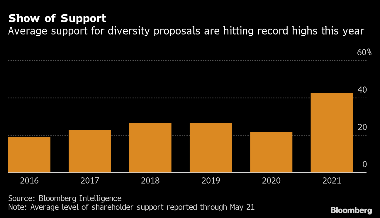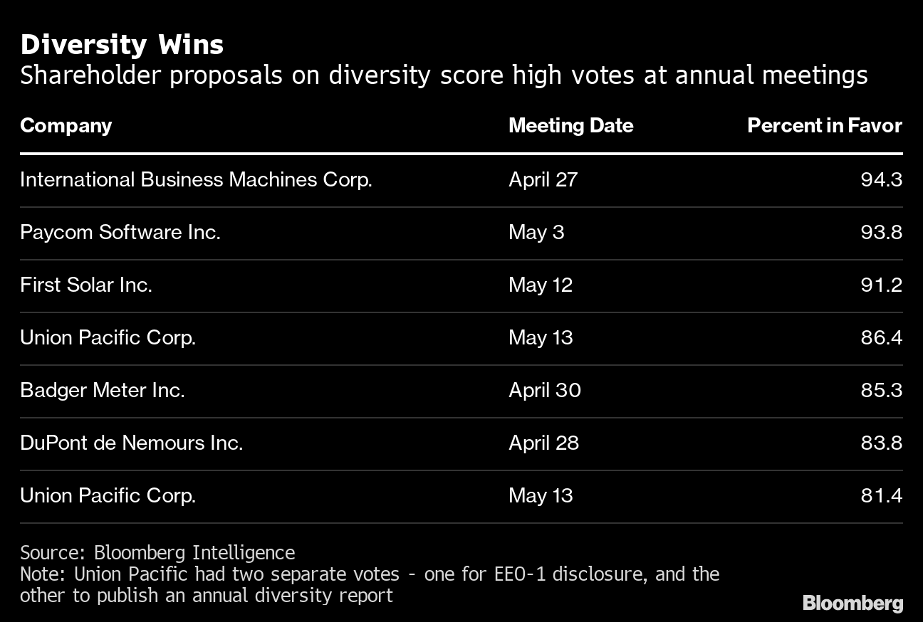 Shareholders submitted a record 37 diversity-related proposals, and they got an average 43% of support as of Friday, according to Bloomberg Intelligence. Two separate proposals at Union Pacific Corp. each garnered more than 80% of shareholder support, while one at American Express Co. got 60%. The ratio may shift even more during the remainder of the so-called proxy season, when public companies face additional shareholder votes in the coming months.