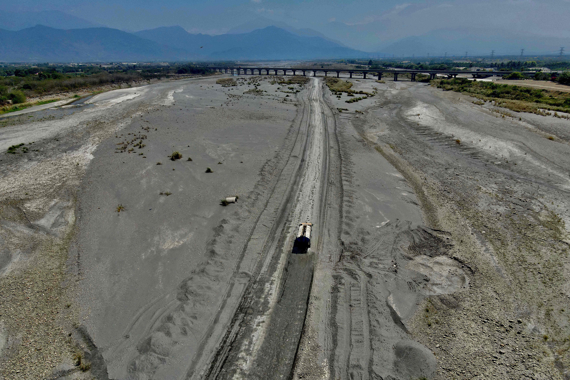 A truck travels along the Ai Liao river bed in Pingtung county, southern Taiwan, on March 16.