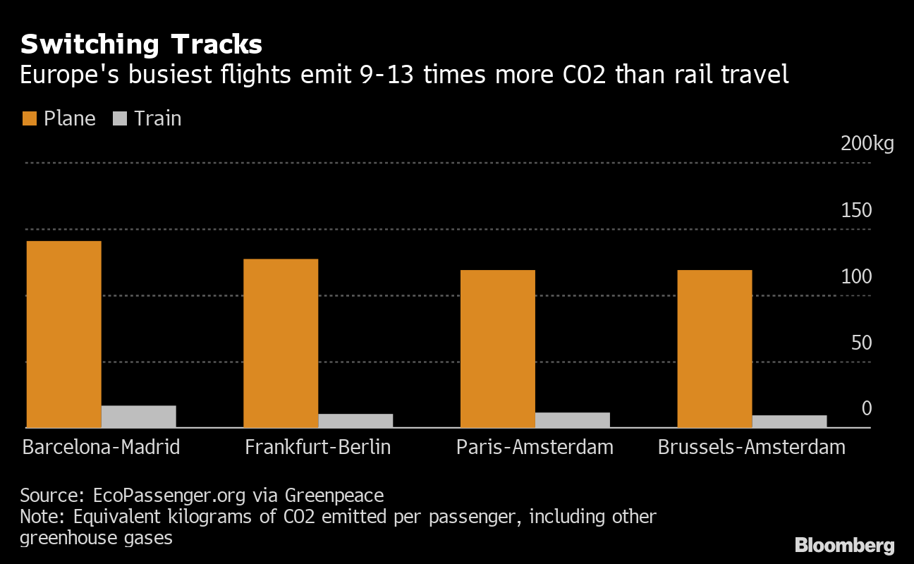 (Bloomberg) -- Environmental group Greenpeace called on the European Union to ban short flights on routes where a train journey under six hours is available, in a sign of growing pressure on governments to take bolder steps to avert climate disaster.