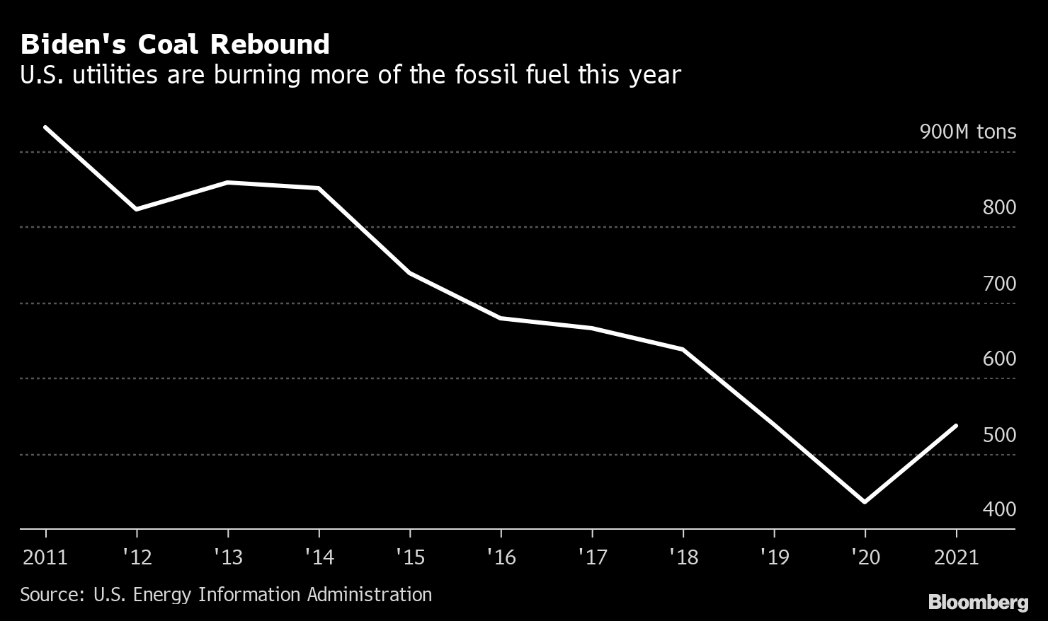 U.S. power plants are on track to burn 23% more coal this year, the first increase since 2013, despite Biden’s ambitious plan to eliminate carbon emissions from the power grid. The rebound comes after consumption by utilities plunged 36% under Trump, who slashed environmental regulations in an unsuccessful effort to boost the fuel.