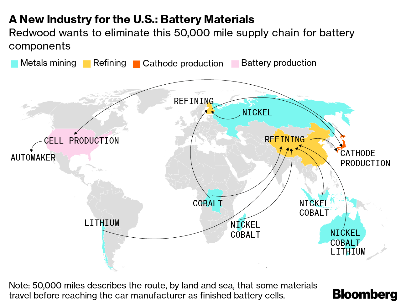 Sure, Redwood has risen quickly to become the biggest lithium-ion battery recycler in the U.S.. But Straubel didn’t leave Tesla in 2019 just to clean out America’s junk drawers. His broader goal, described to Bloomberg for the first time, is to move a huge chunk of the battery-component industry from Asia to the U.S.