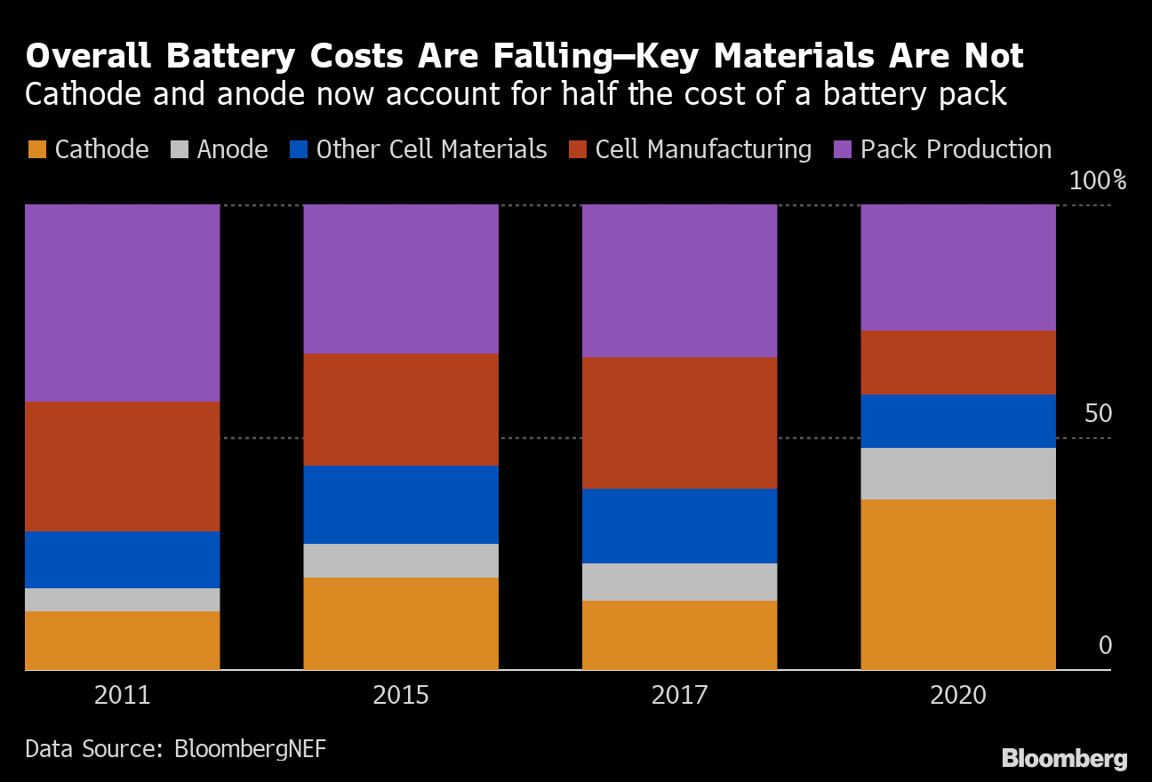 These EV promises are predicated on the economic force of falling battery prices. Every time the global supply of batteries doubles, the price of making them drops about 18 percent, according to data tracked by BloombergNEF. It’s a learning curve driven by large investments in battery manufacturing like Tesla’s battery Gigafactory in Nevada. There’s one glaring exception to this rule: battery materials.