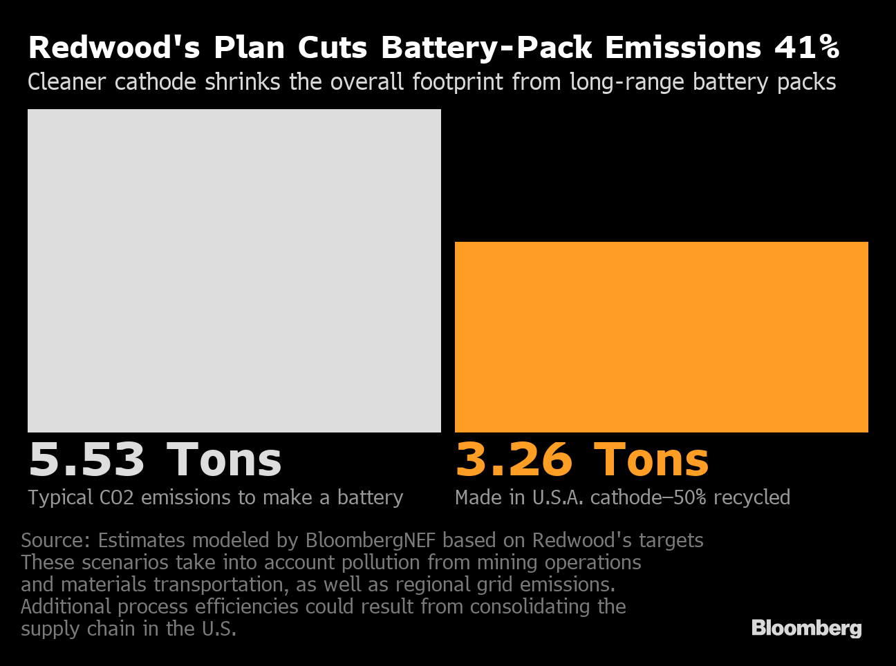 In the U.S., it take about 16,000 miles of driving before an electric vehicle becomes a net positive for the environment — or roughly a year and half of car ownership for the average American driver, according to BloombergNEF. Redwood’s plan would nearly cut that in half, according to Frith. Consolidating the supply chain in the U.S. and using 50% recycled material would cut the emissions from battery-pack manufacturing by at least 41%.