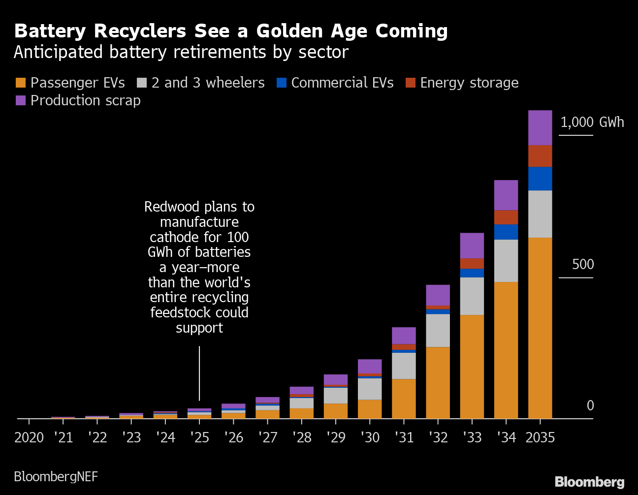 s,producing sThe company, a component in short supplyAThe company’s target of 100 GWh in 2025 means it can no longer rely on recycled materials alone. Unlike some consumer electronics, there’s a long lag between when electric cars are made and when their batteries are ready to be recycled. The reuse of packs in secondary applications can delay that further. Today, electric cars account for less than 10% of Redwood’s recycling stock. “We’re going to push the recycled percent as high as possible, but that is really going to be dependent on the availability of recycled materials,” Straubel said. “If we end up consuming 50% or more of virgin raw materials, that’s fine.”