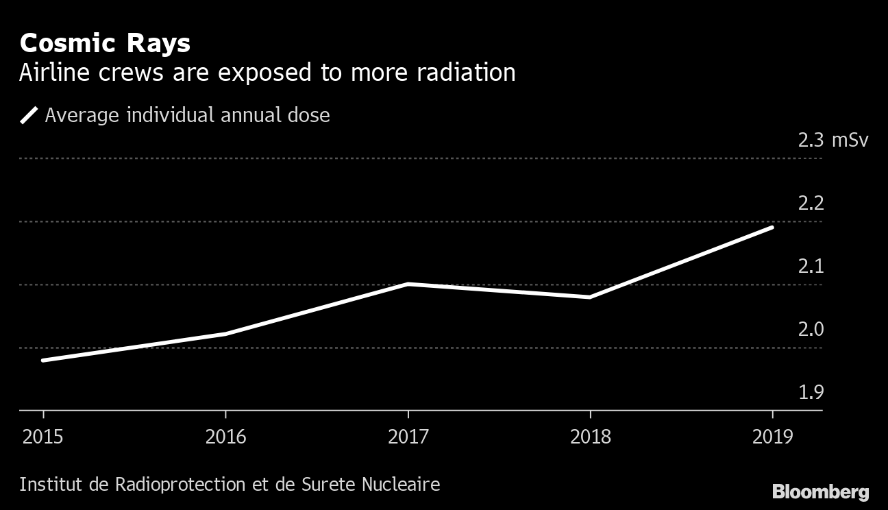 (Bloomberg) -- Airlines are exposing their personnel to increasing amounts of radiation as planes fly longer distances, with pilots receiving the highest annual doses, France’s nuclear safety institute warned in a new report.