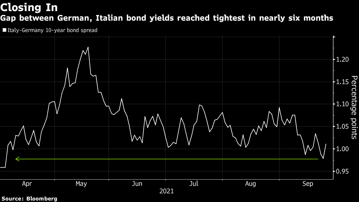Optimism in Rome is also more important than German politics, with Italian bonds catching up with their safer German peers. The yield spread narrowed Thursday to the tightest since April following news the Italian Treasury would skip some regular debt sales given the country’s improving economic prospects. Ten-year bund yields, meanwhile, have risen about 30 basis points since early August.