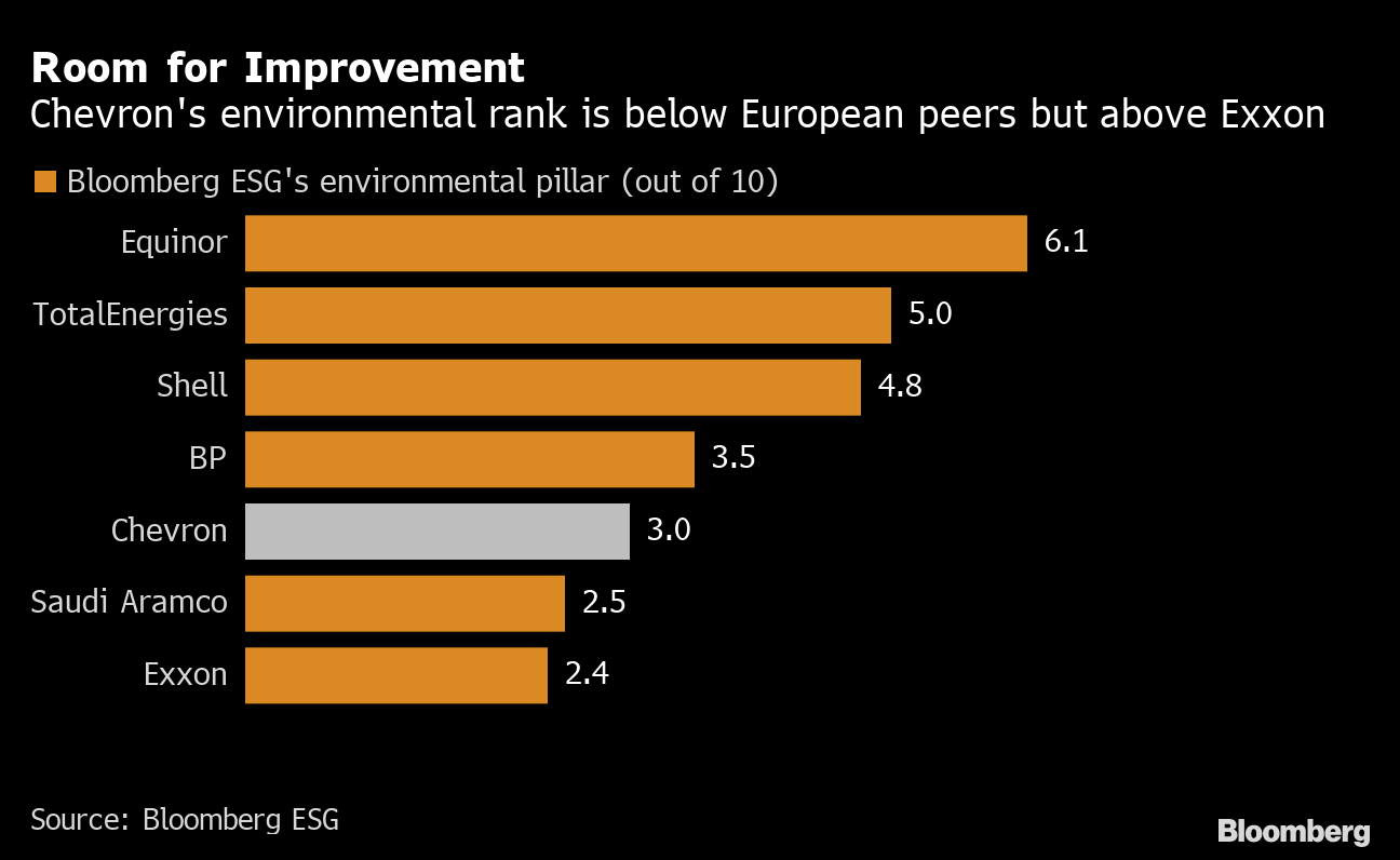 Chevron’s environmental pillar score of 3.01 out of 10 is below those of Equinor ASA and Shell, but surpasses Exxon, Saudi Aramco, and the state-backed oil majors in Russia and China, according to Bloomberg’s ESG ratings.
