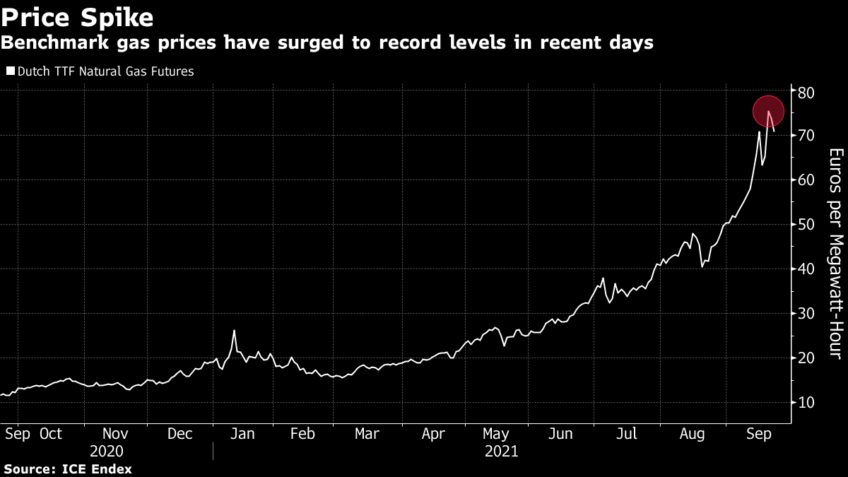 (Bloomberg) -- The unprecedented spike in natural gas and power prices is forcing its way up the European Union’s political agenda after hijacking a meeting of member states on the bloc’s ambitious transition to a green economy.