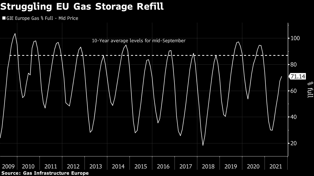 European gas inventories are at their lowest level in more than a decade for this time of year. Gazprom PJSC’s CEO Alexey Miller said Europe will enter the winter in about a month without fully replenishing its buffer stockpiles. The Russian gas giant has been pushing to start its controversial Nord Stream 2 pipeline.