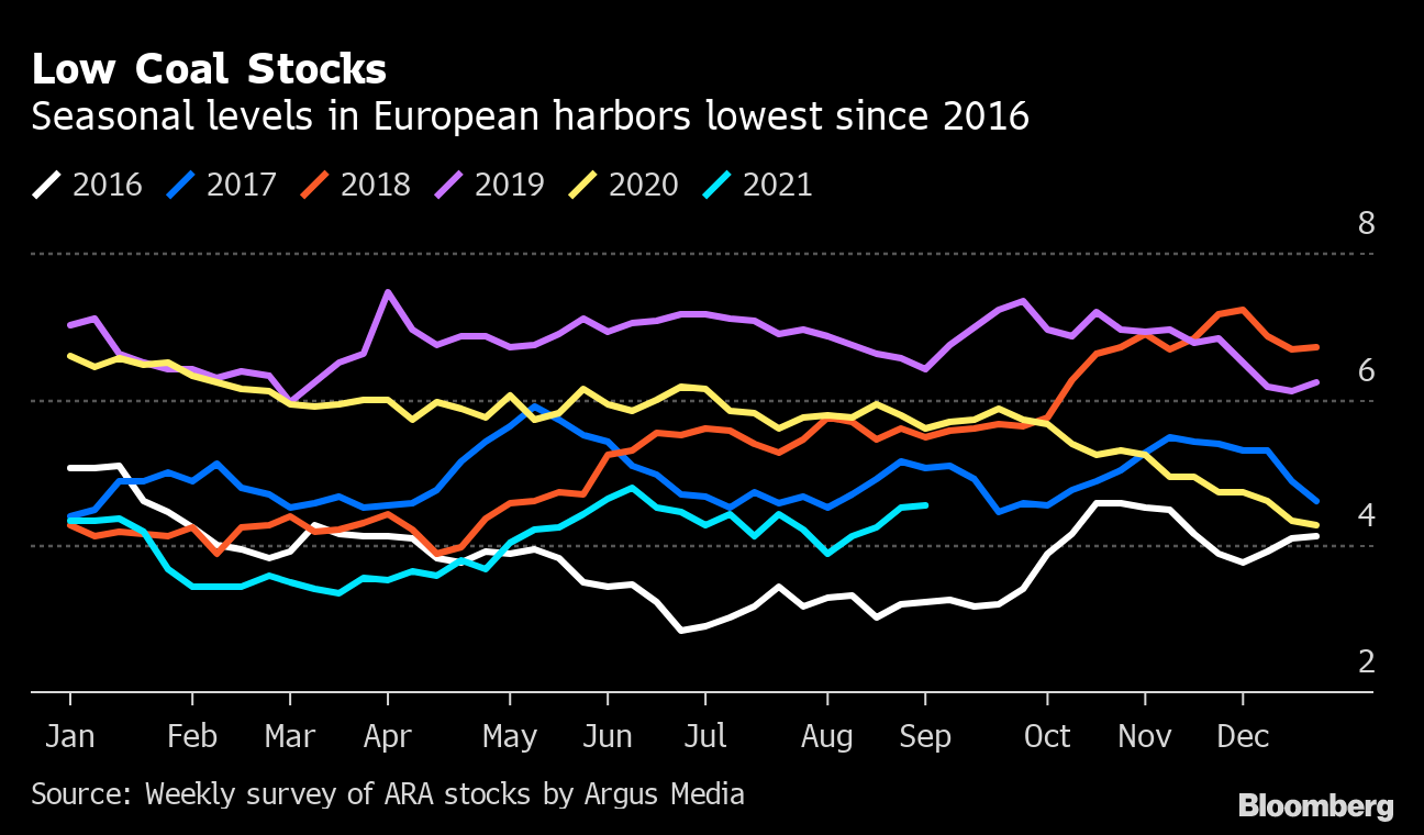 Higher gas prices boosted the cost of producing electricity as renewables faltered. Low wind speeds forced European utilities to burn expensive coal, depleting stockpiles of the dirtiest of fossil fuels. Energy policy also played a role, with the cost of polluting in the European Union surging more than 80% this year.