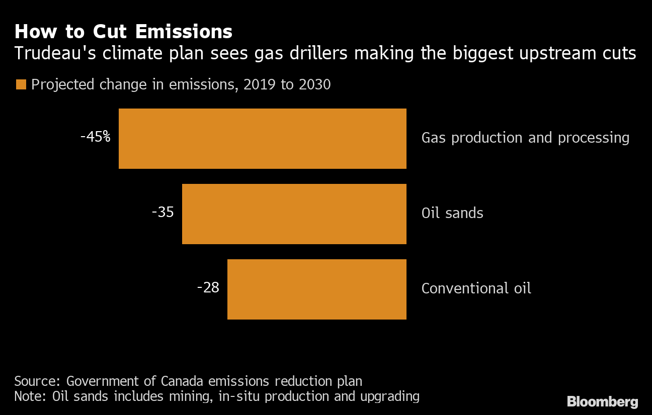 (Bloomberg) -- Canada’s natural gas producers will face the greatest burden among energy companies under Prime Minister Justin Trudeau’s new emissions-reduction plan, just as the industry faces renewed pressure to increase output.