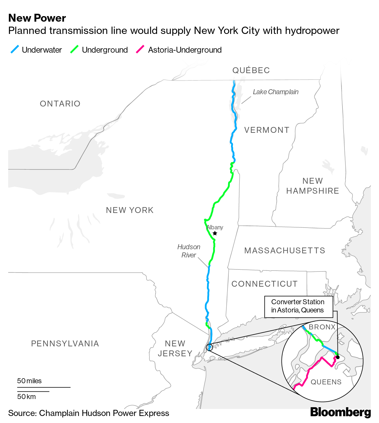 (Bloomberg) -- Regulators approved a $4.5 billion transmission line that will deliver Canadian hydropower to New York City, a key component of the Empire State’s efforts to eliminate carbon from its power grid by 2040.