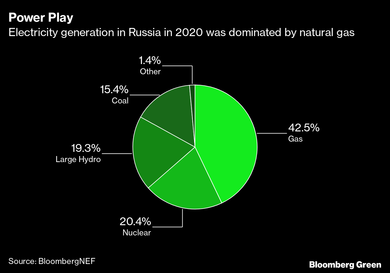 Russia’s economy remains deeply reliant on fossil fuels, with coal and gas generating about 58% of the country’s power needs, according to clean energy researchers at BloombergNEF. Hydropower and nuclear were responsible for almost 40% in 2020, with wind and solar barely registering in the country’s energy mix.