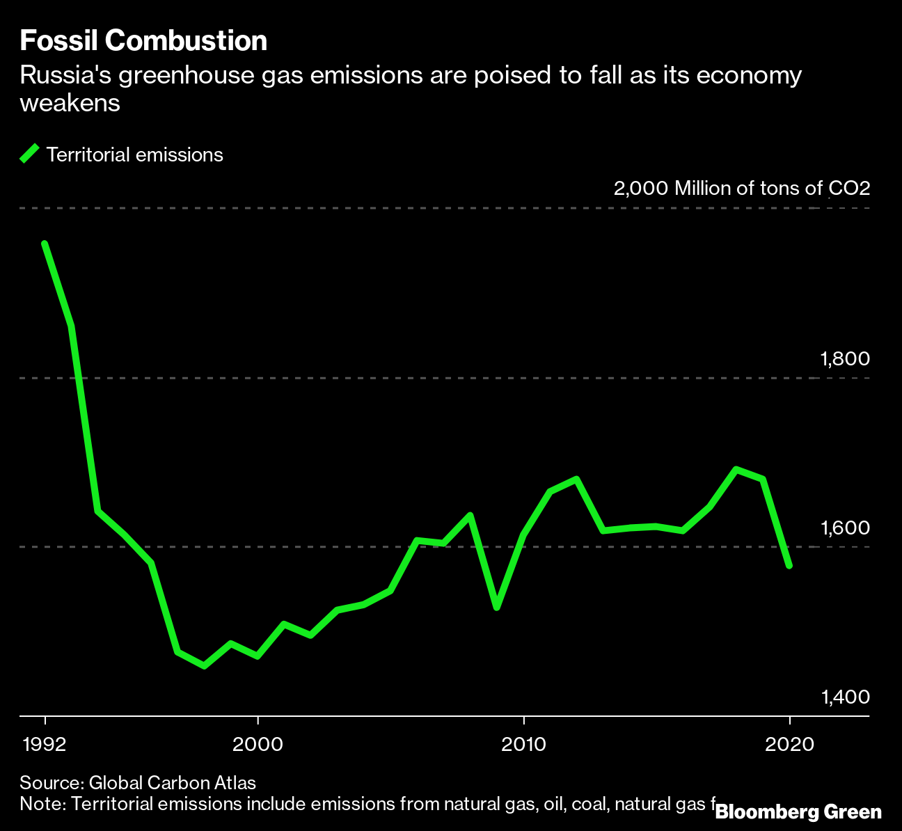 Russia’s overall emissions are poised for a drop this year as its economy contracts, but industries that survive won’t be able to cut carbon pollution as quickly and may even become dirtier with time. External pressure to lower emissions, such as Tesla Inc.’s search for cleaner nickel or the European Union’s move to impose a carbon levy on imports such as steel, has faded as foreign countries and companies spurn Russian goods.