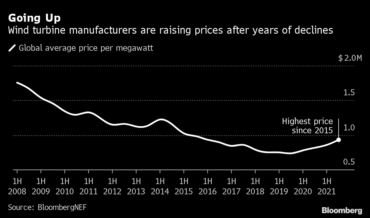 That has begun to change. Turbine manufacturers in the second half of last year raised prices the most since 2014, according to BloombergNEF. Wind farm developers expect that to reverse the decade-plus trend of falling costs for wind power, a key factor that has fueled its expansion.