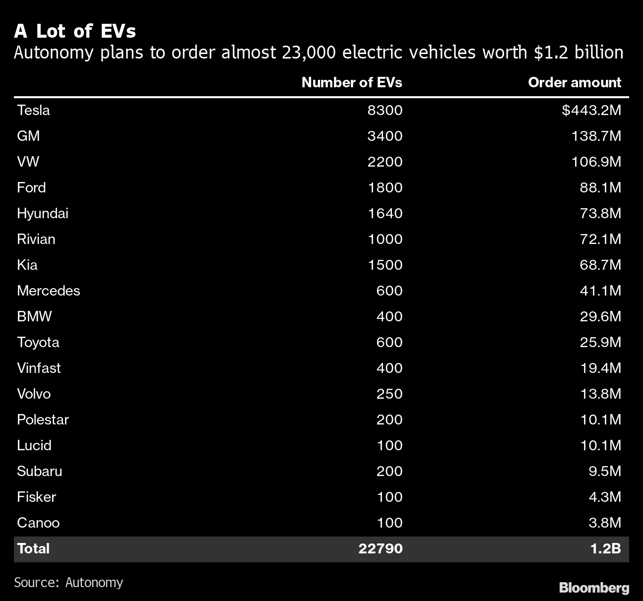 Tesla Inc., the market leader in battery-powered cars, is expected to account for 8,300 vehicles worth $443 million, according to the company. Autonomy plans to order 3,400 Bolt EVs and EUVs from General Motors Co., 2,200 vehicles from Volkswagen AG, 1,800 from Ford Motor Co., and 1,640 units from Hyundai Motor Co. It will also buy from newer players such as Lucid Group Inc. and Rivian Automotive Inc.