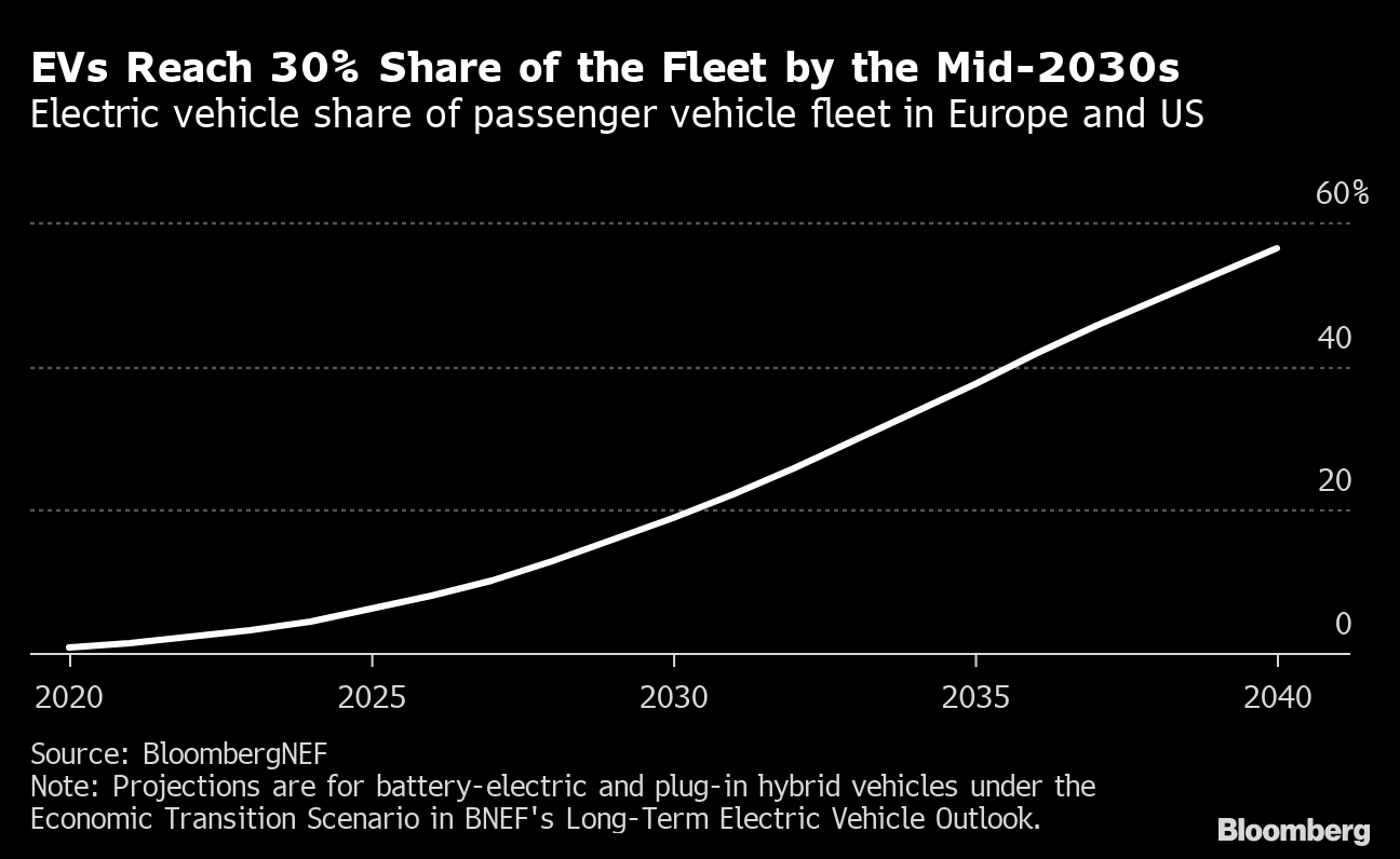 Between 2030 and 2035, electric vehicles will make up 15% to 33% of the passenger vehicle fleet in Europe and the US, and EV charging will be truly mass market.