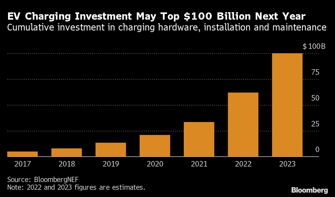 (Bloomberg) -- BloombergNEF recently released its updated Zero-Emission Vehicles Factbook, which estimates cumulative investment in EV charging hardware and installation will reach $62 billion at the end of this year, with $28.6 billion having been invested just in 2022, up 228% from the year before. Of the total investment in 2022, 61% is attributed to more than 600,000 public chargers built in China.