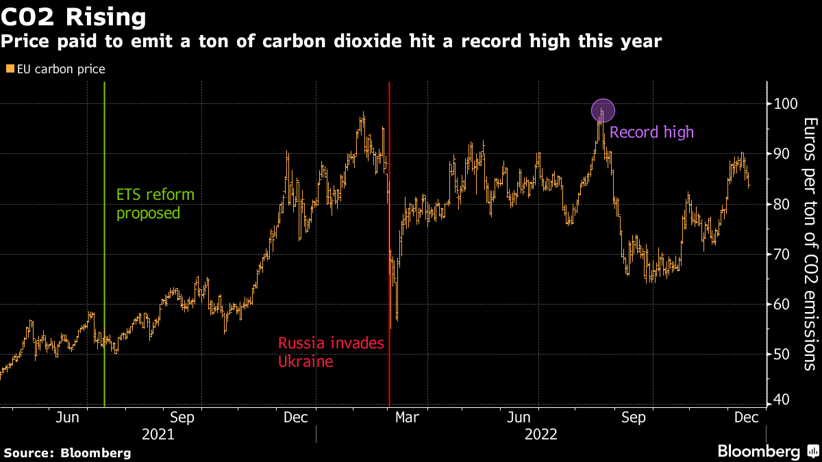 Expectations of stricter rules already helped send carbon prices to a record 99.22 euros ($105) per metric ton this year. Benchmark carbon futures traded in Amsterdam closed at 83.82 euros on Friday, more than 10 times the levels seen five years ago. The agreement still needs to be formally endorsed by member states and the parliament to be binding.