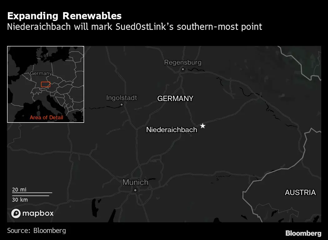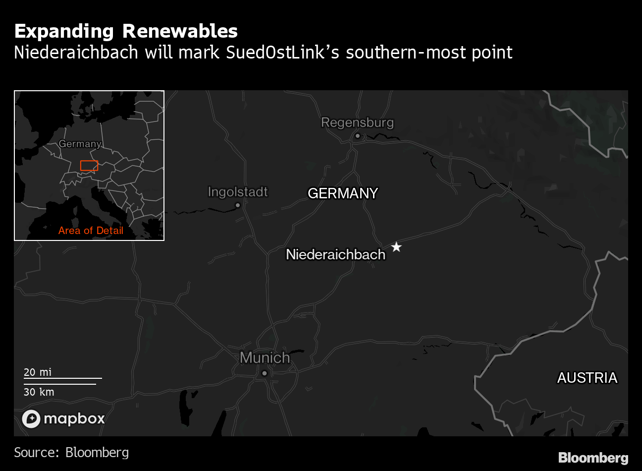SuedOstLink is one of two big electricity highways that will bring offshore-wind power from Germany’s northern coasts to its industrial heartlands. Niederaichbach — just a few kilometers from BMW AG’s largest German car factory — will mark the grid’s southern-most point.