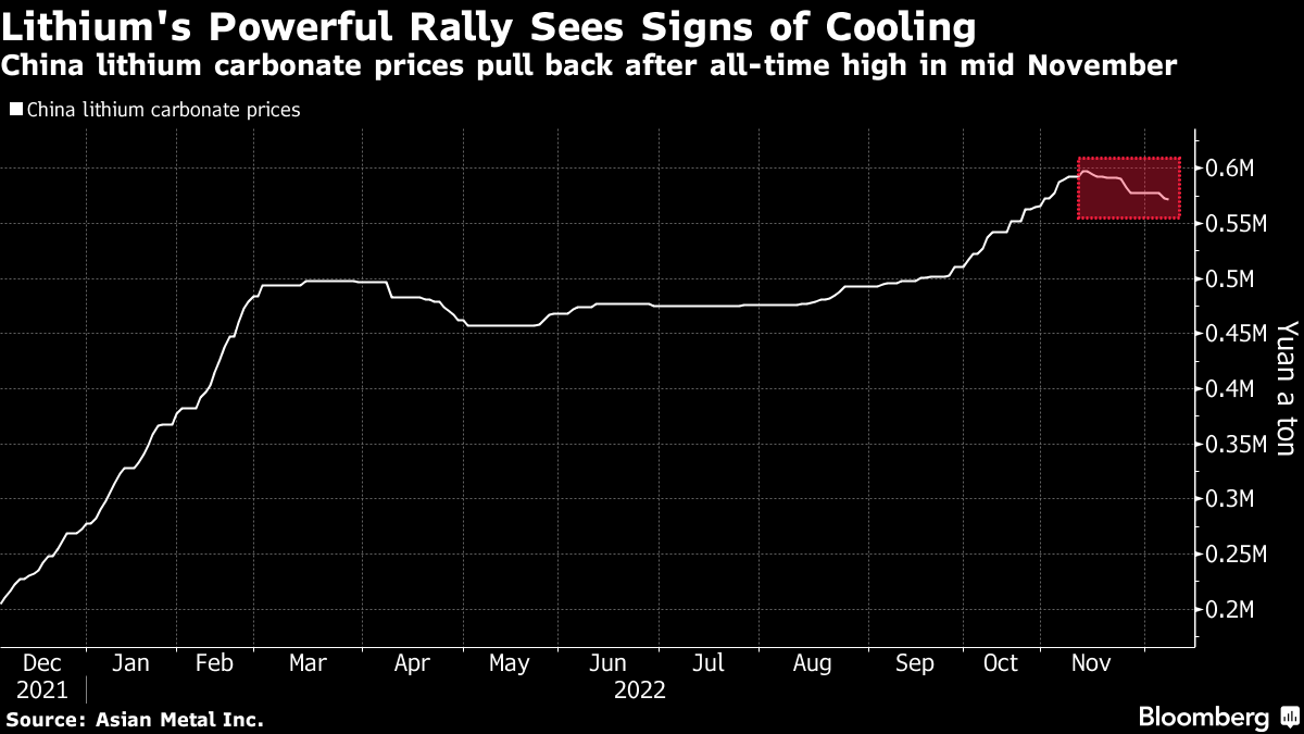 The production cuts from the two firms aren’t enough to offset slower demand, said Susan Zou, an analyst at Rystad Energy. She expects the downturn in prices to continue in 2023, although losses won’t be large, at least in the first quarter, because the supply of lithium compounds remains tight.