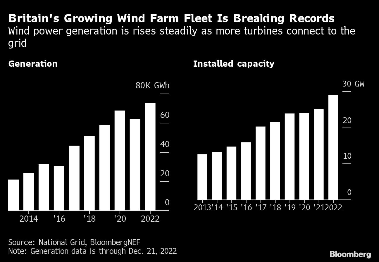 (Bloomberg) -- Britain’s wind farms generated a record amount of electricity this year as gusty weather and a growing fleet of turbines softened the impact of soaring natural gas prices.
