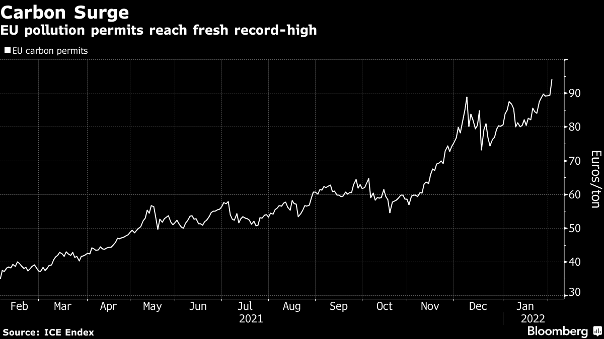 EU carbon futures gained past the key 90 euros ($102) a ton marker, as higher gas prices drove power generators to switch toward more carbon-intensive fuel. Even with rising pollution-permit costs, it’s still more profitable to burn coal for power than gas.
