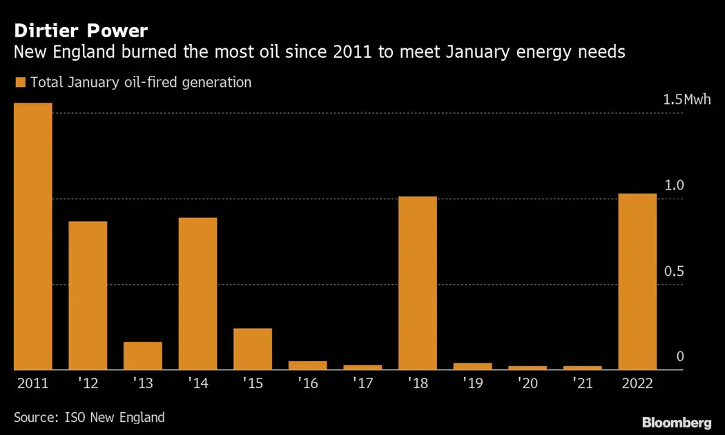 (Bloomberg) -- New England has burned the most oil to generate electricity in over a decade this winter, despite being only a couple hundred of miles away from one of the world’s largest fields of natural gas. That’s driving up emissions and putting politicians and industry leaders at odds.
