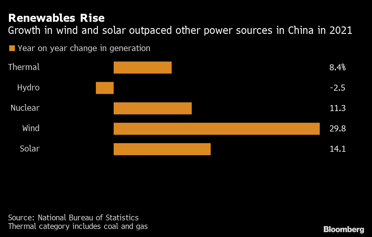 (Bloomberg) -- China remains as tied as ever to fossil fuels, even as it adds more renewable power than any other nation. Last year, the share of coal and gas in power generation was stuck at 71%, the same as 2020.