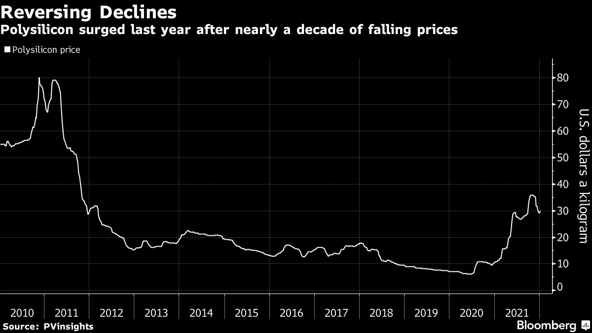 As component shortages to a squeeze on shipping drive up prices for everything from natural gas to beef, polysilicon is an example of how some supply woes will likely prove transitory. It also shows how China is using its industrial heft to ensure its continued dominance in solar, a sector that’s key to fending off the worst impacts of climate change.