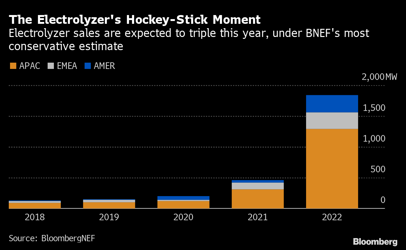 “It’s quite difficult to order electrolyzers now,” said Mao Zongqiang, a professor at the Institute of Nuclear and New Energy Technology at Tsinghua University in Beijing. “The supply can’t meet the demand.”