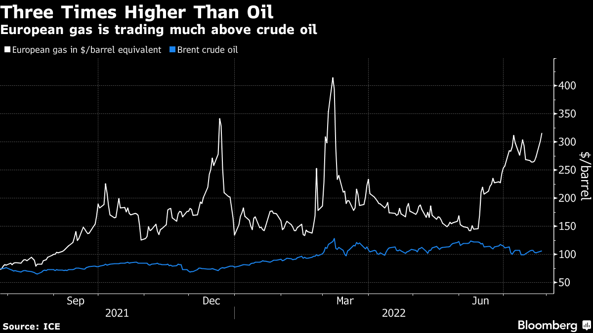 Prices have soared since Russia’s Gazprom PJSC said it will halt another turbine that pumps gas into the Nord Stream pipeline, slashing flows through the link to just 20% of capacity from Wednesday. Moscow has steadily reduced shipments through the link over the past month, citing technical reasons, exacerbating a crisis that’s squeezed everything in Europe from the economy to the currency.