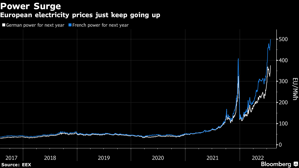 German year-ahead power climbed as much as 11% to a record 380 euros per megawatt-hour on the European Energy Exchange. The equivalent French price jumped as much as 6.7% to an all-time high.