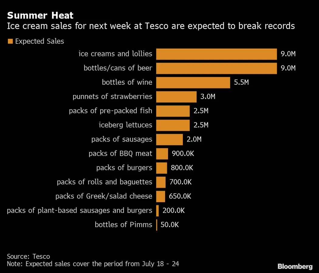 Supermarket chain Tesco Plc expects to sell more than 9 million ice creams and lollies in the coming week, a record. The supermarket also expects to sell 9 million bottles and cans of beer and 50,000 bottles of Pimms, the classic British summer gin-based fruit drink.