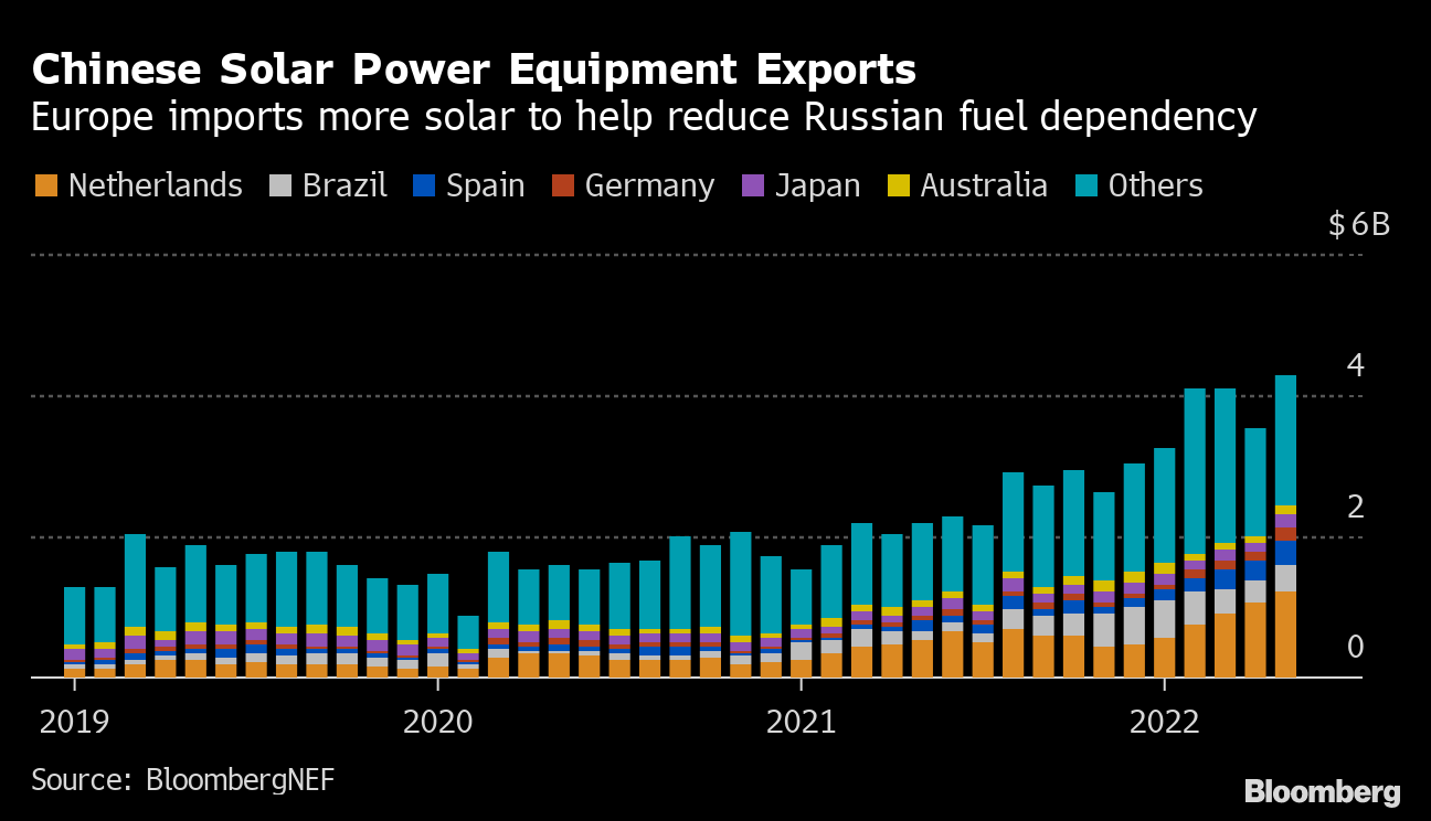 Chinese solar exports have surged this year, especially to Europe, as countries there try to speed up their energy transitions to wean themselves off Russian energy sooner following the invasion of Ukraine. Total exports in May were $4.3 billion, nearly doubling from the previous year.