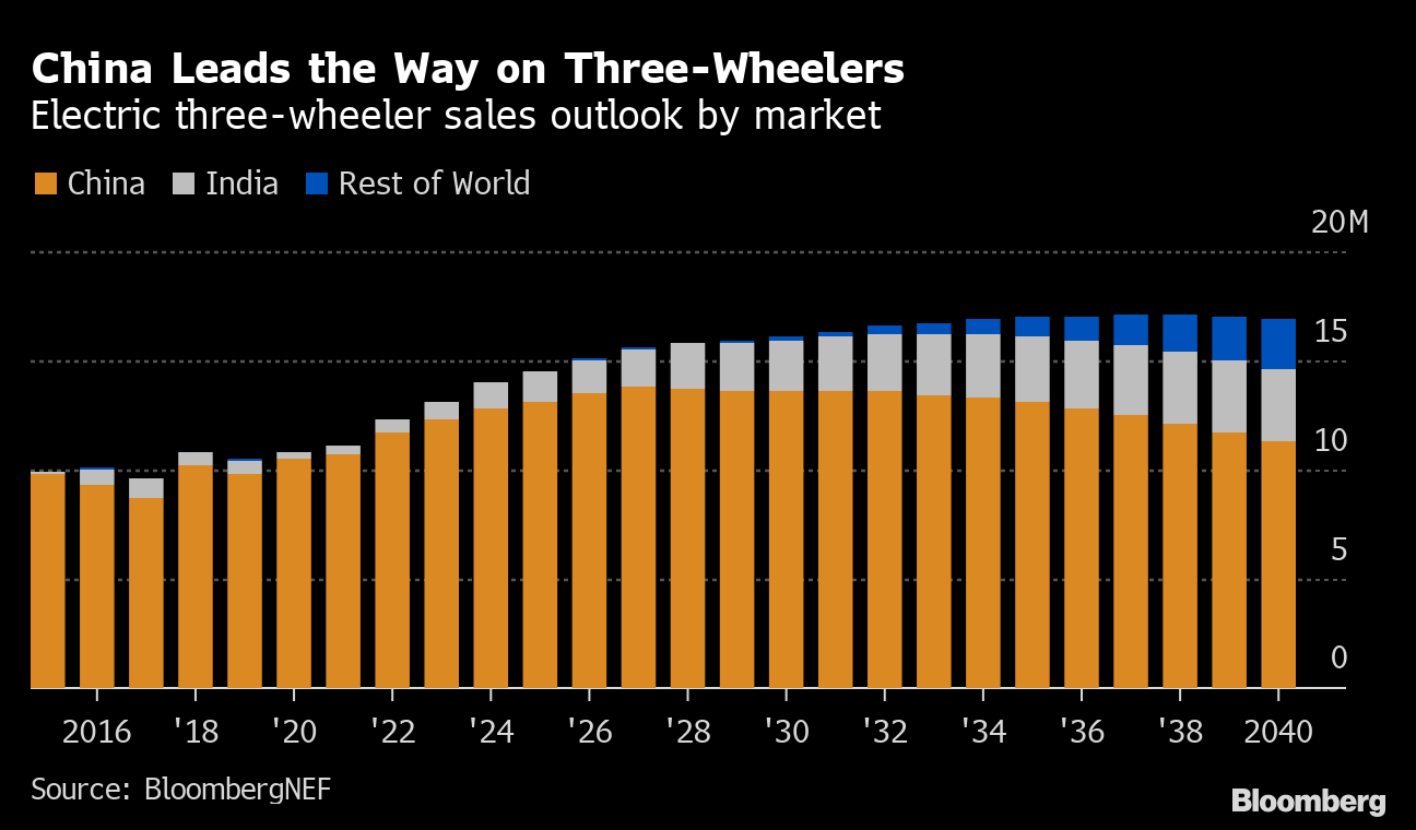 Of the 117 million three-wheelers on the road globally last year, according to BloombergNEF’s Electric Vehicle Outlook, more than 90% were in China and India. China alone has a fleet of roughly 100 million, primarily used for hauling passengers and cargo on short trips. Nearly 70% of the global fleet is electric, mostly using lead-acid batteries, though a swift transition to lithium-ion is underway. BNEF expects global sales of electric three-wheelers to pass 12 million units this year, with fewer than 10,000 outside of China and India.